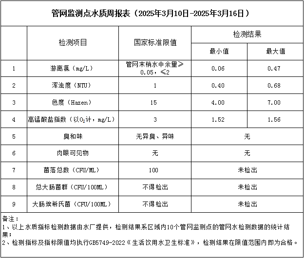管網(wǎng)監(jiān)測點水質(zhì)周報表(2025年3月10日-2025年3月16日)