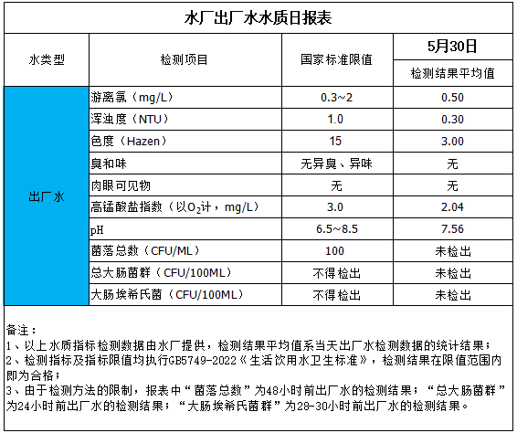 水廠出廠水水質(zhì)日報表(2025-5-30)