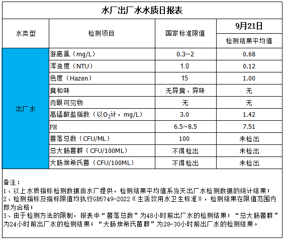 水廠出廠水水質(zhì)日?qǐng)?bào)表(2025-9-21)