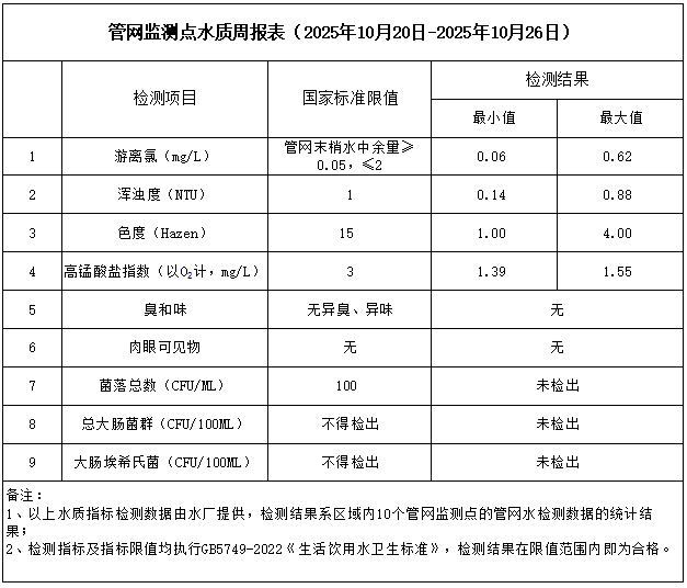 管網(wǎng)監(jiān)測點水質周報表(2025年10月20日-2025年10月26日)