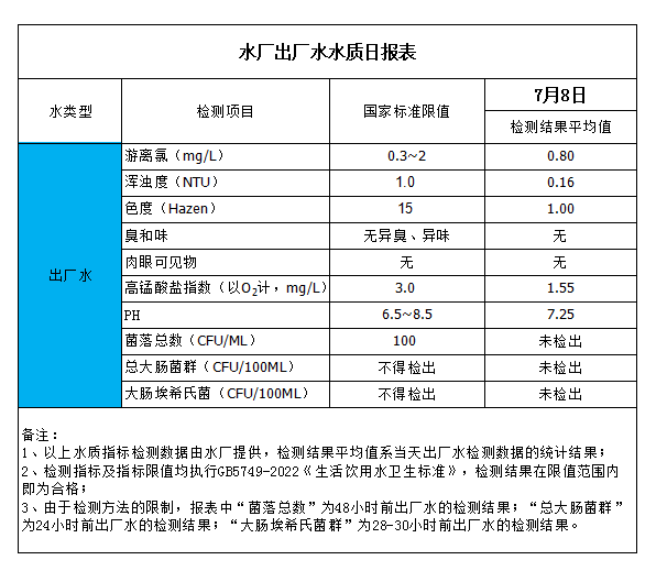 水廠出廠水水質日報表(2023-7-8)