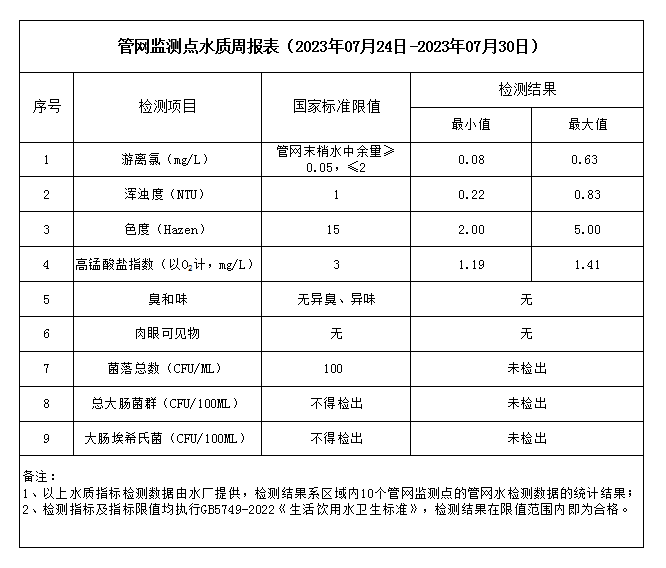 管網監測點水質周報表(2023年07月24日-2023年07月30日)