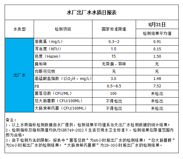 水廠出廠水水質(zhì)日報表(2023-8-31)