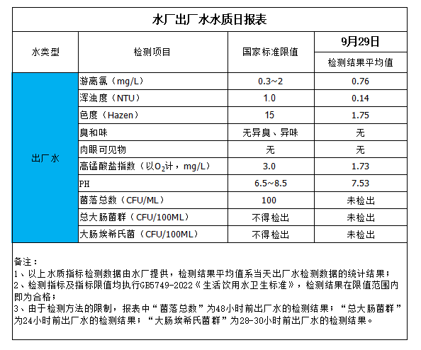 水廠出廠水水質日報表(2023-9-29)
