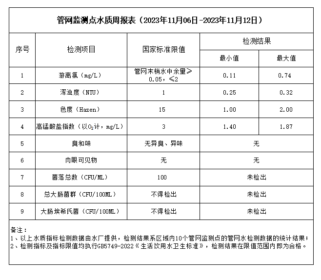 管網監測點水質周報表(2023年11月06日-2023年11月12日)