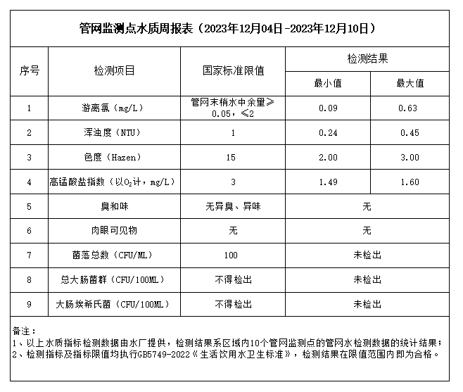 管網(wǎng)監(jiān)測(cè)點(diǎn)水質(zhì)周報(bào)表(2023年12月04日-2023年12月10日)