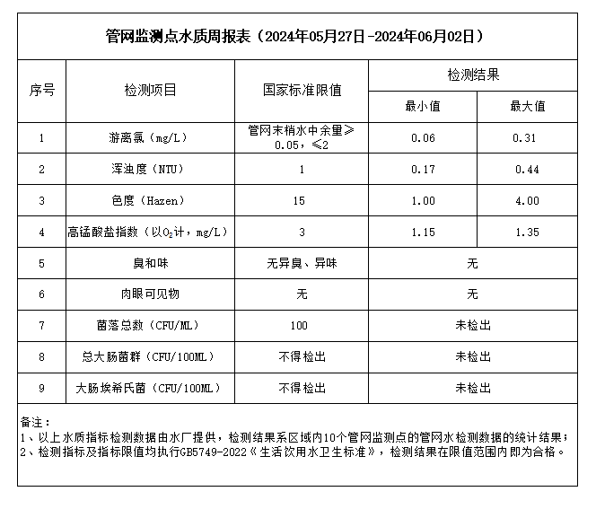 管網(wǎng)監(jiān)測點(diǎn)水質(zhì)周報(bào)表(2024年05月27日-2024年06月02日)