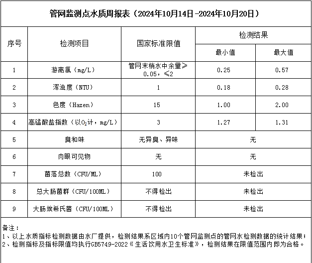 管網(wǎng)監(jiān)測(cè)點(diǎn)水質(zhì)周報(bào)表(2024年10月14日-2024年10月20日)