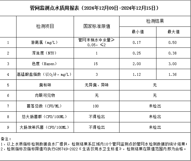 管網(wǎng)監(jiān)測點(diǎn)水質(zhì)周報(bào)表(2024年12月9日-2024年12月15日)
